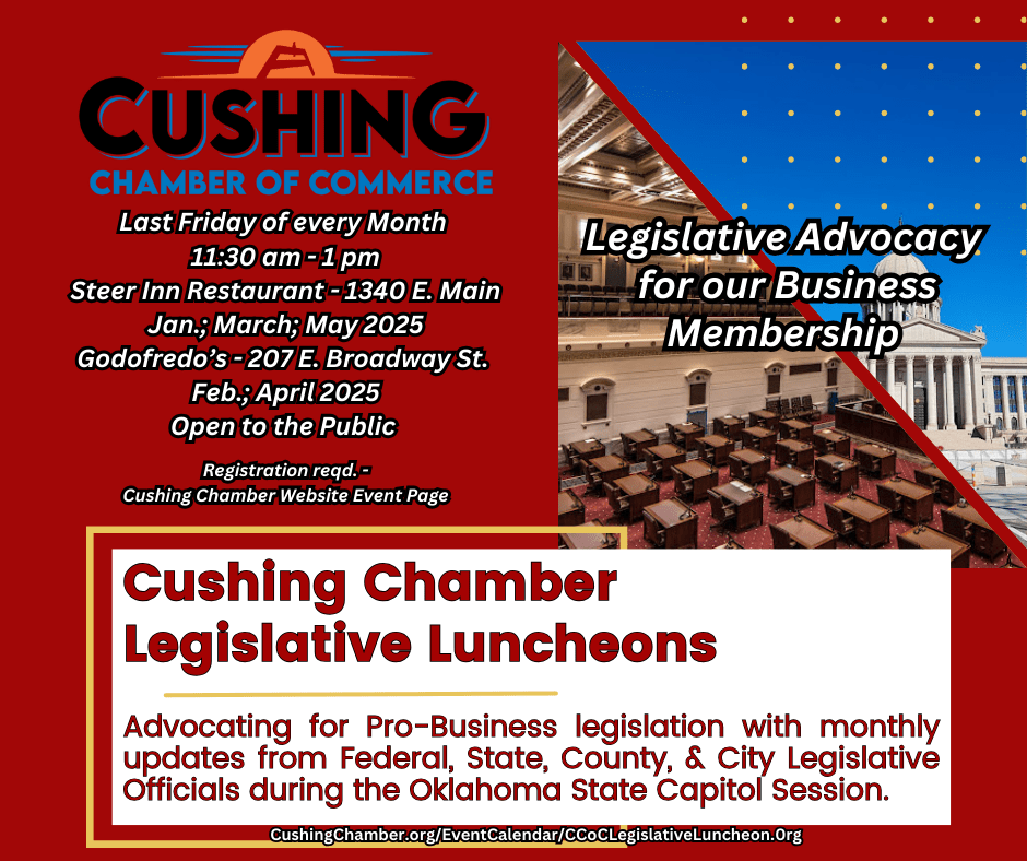 The Cushing Chamber Legislative Luncheons are the last Friday of every month that the Oklahoma State Capitol is in session, Jan. 2025 through May 2025.