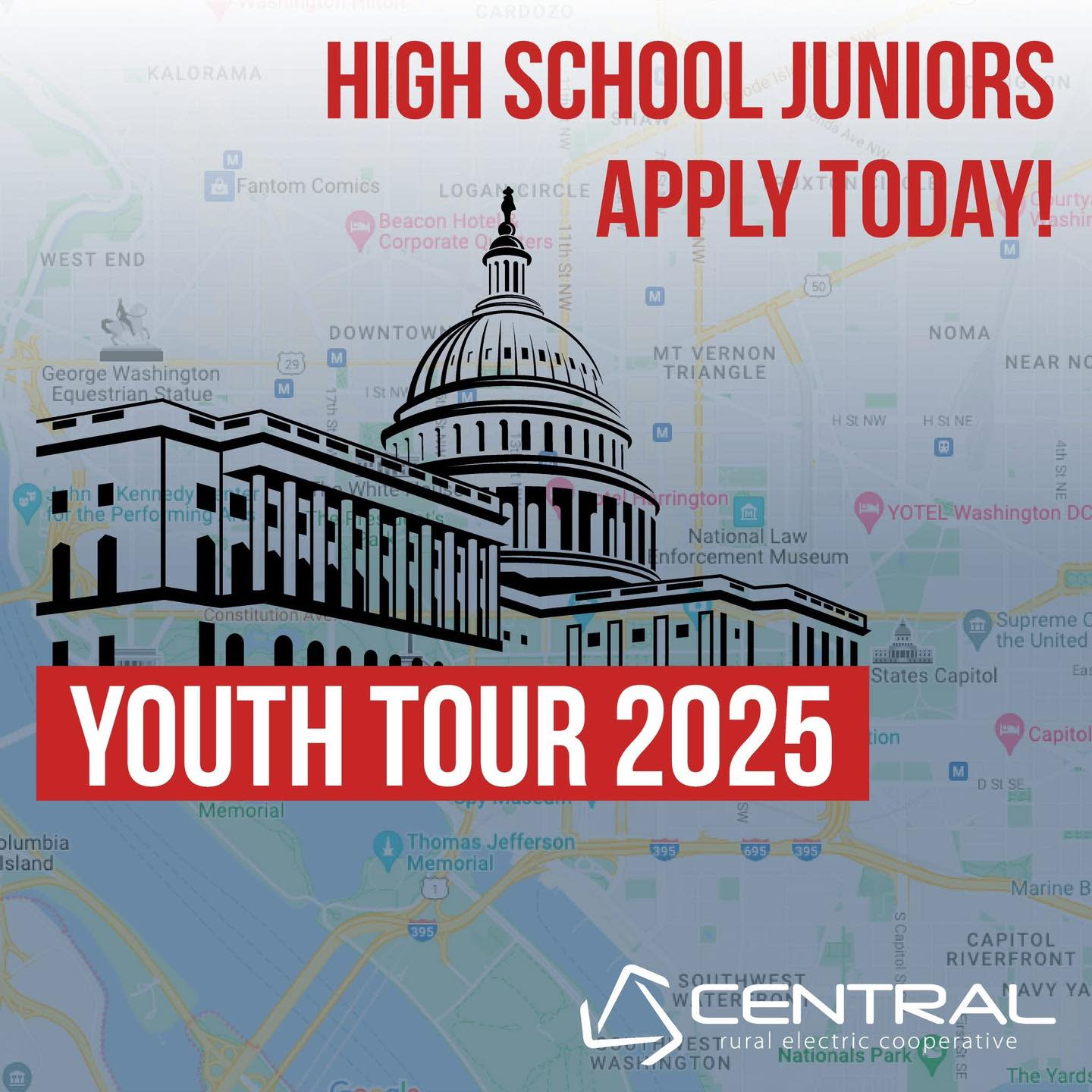 Central Rural Electric Cooperative is currently accepting applications for the 2025 Youth Tour contest. To learn more about Youth Tour and the application process please visit mycentral.coop/youthtour