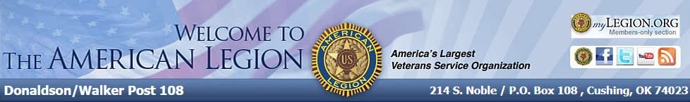 Cushing, Oklahoma’s American Legion Post 108 is currently named the American Legion Irvin F. Donaldson – Joe J. Walker Post No. 108. It has a membership of some 170 members. The Post has a long and proud history of achievement in the community, District, and State of Oklahoma. Post 108 has been an integral part of the history of downtown Cushing and the Cushing community since 1919. Post 108 was named Oklahoma Post of the Year in 2009-2010, and placed 2nd in 2010-2011, and 3rd in 2011-2012.