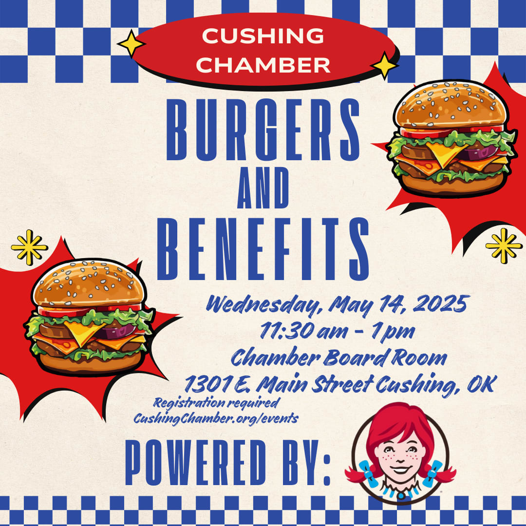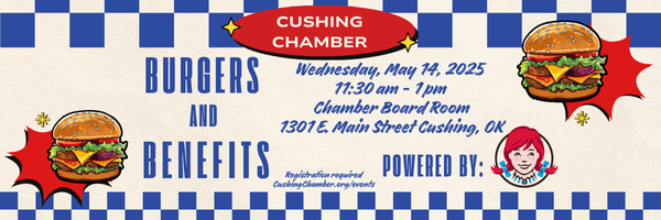 Join us for Burgers & Benefits, a fun and engaging Membership 101 class where we’ll go over all the ways the Cushing Chamber of Commerce can help your business grow and thrive—served up alongside a delicious burger!
