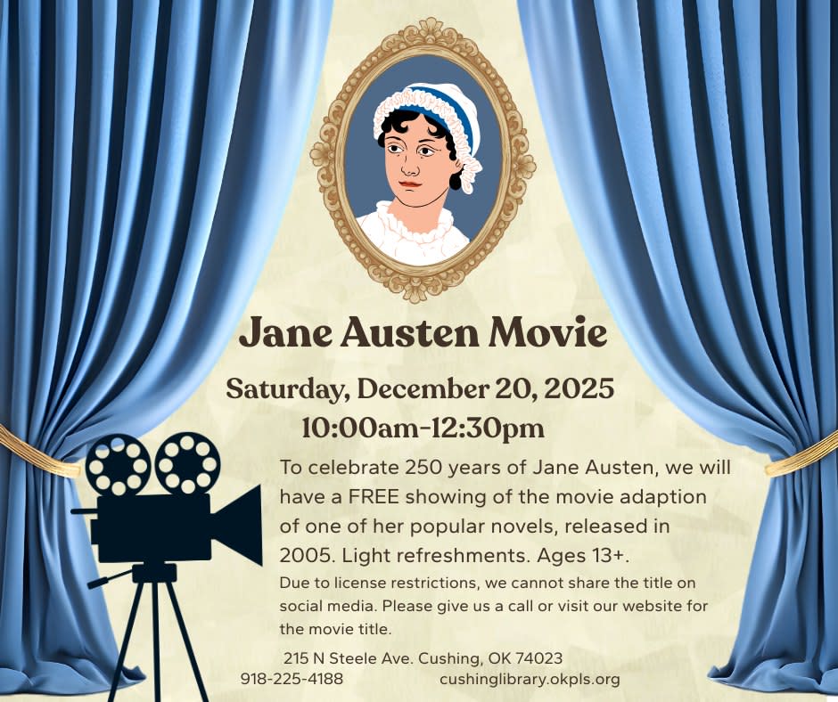To celebrate 250 years of Jane Austen, we will have a FREE showing of the movie adaptation of one of her popular novels, released in 2005. Due to restrictions, we cannot share the title. Please give the Cushing Public Library a call at 918-225-1488 or visit their website: cushinglibrary.okpls.org for the movie title.