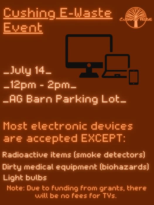 DESCRIPTION:You asked for it and we made it happen!CUSHING PRIDE RECYCLING PRESENTS:CUSHING E-WASTE EVENT JULY 14\, 2024 12 PM - 2 PM CUSHING HIGH SCHOOL AG BARN PARKING LOT Most electronic devices are accepted EXCEPT: \nRadioactive items (smoke detectors) \nDirty Medical Equipment (biohazards) \nLight Bulbs  Cushing Pride Recycling will be hosting an E-waste recycling event scheduled for July 14th from 12-2 at the parking lot east of the football field. This event will collect most items with a cord. They will also accept items that are still in working condition as they provide computers\, etc. to other non-profits. Examples of items accepted at this event include\, but are not limited to:Microwaves TVs Computers Cell phones Toasters Thanks to the help of grant funding\, there will be no charge for TV disposal! Thanks to our partners for helping make this event happen!