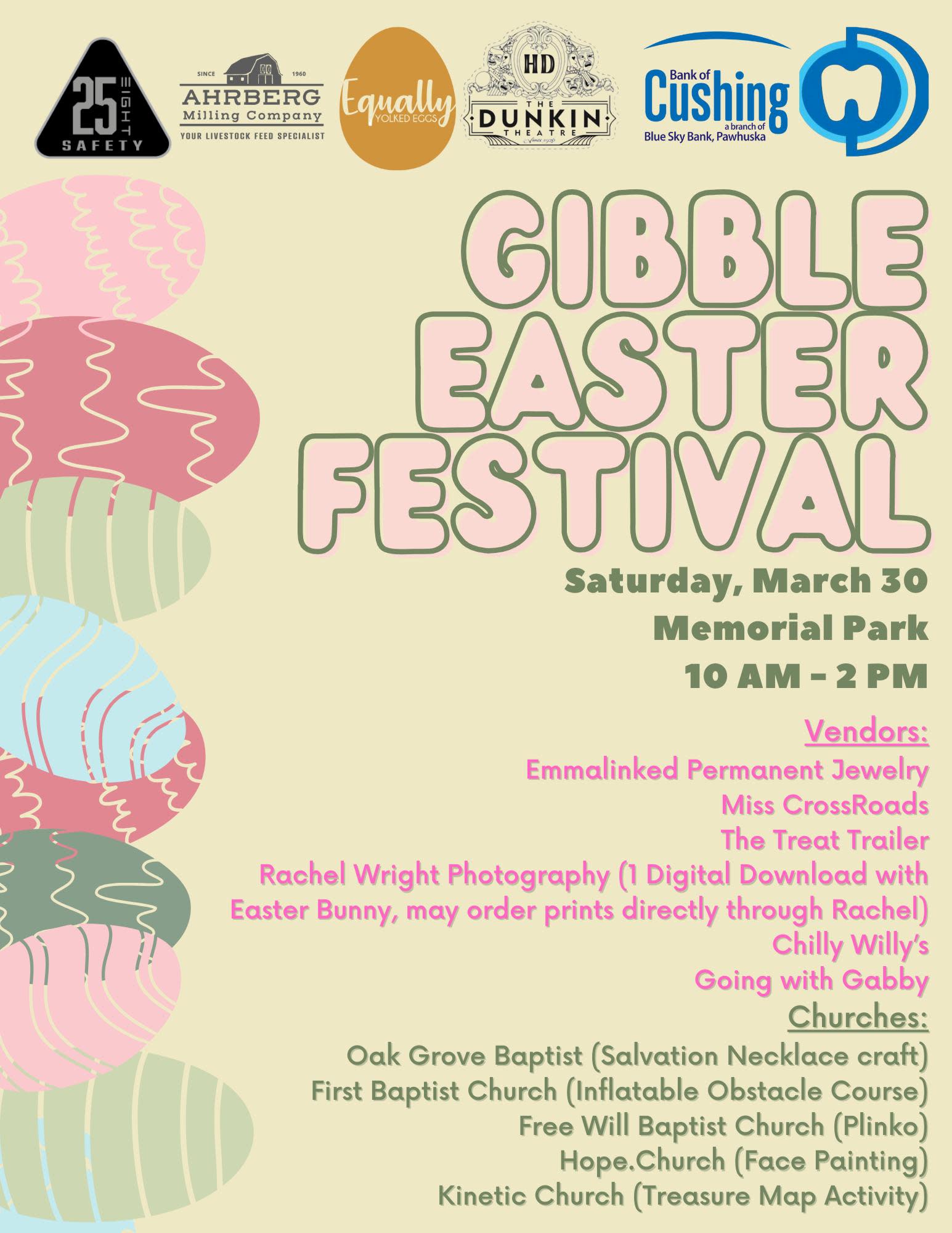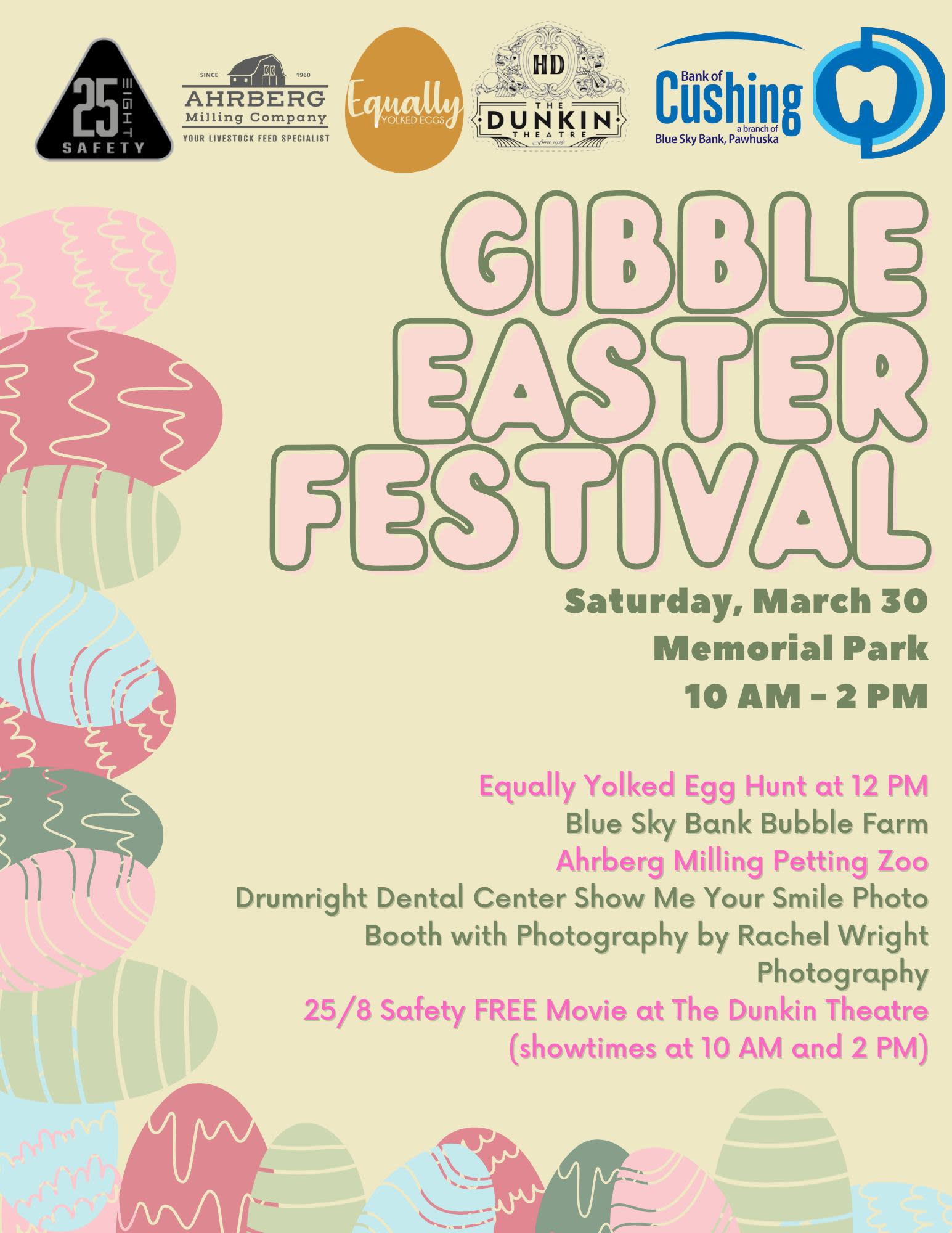 DESCRIPTION:GIBBLE EASTER FESTIVAL SATURDAY\, MARCH 30\, 2024 10 AM - 2 PM CUSHING MEMORIAL PARK - 500 S. LITTLE AVE. CUSHING\, OK 🐰🐣🐥🐇Get your baskets ready!The Gibble Easter Festival is scheduled for Saturday\, March 30 from 10 AM - 2 PM at Memorial Park in Cushing!The Gibble Easter Festival will feature TWO FREE showings of an Easter movie (Featuring-Peter Rabbit 2 ). 25/8 Safety is sponsoring a FREE drink and popcorn for each child 12 and under. Movie showtimes will be 10 AM and 2 PM.We will also have the Blue Sky Bubble Farm\, Ahrberg Milling Petting Zoo\, and Drumright Dental Center Show Me Your Smile Photo Booth.The Equally Yolked Egg Hunt will be at High Noon sharp in Memorial Park.Vendors: Emmalinked Permanent Jewelry\, Mis CrossRoads\, The Treat Trailer\, Rachel Wright Photography(1 Digital Download with Easter Bunny\, may order prints directly through Rachel)\, Chilly Willy's\, Going with GabbyChurches: Oak Grove Baptist (Salvation Necklace Craft)\, First Baptist Church (Inflatable Obstacle Course)\, Free Will Baptist Church (Plinko)\, Hope.Church (Face Painting)\, Kinetic Church (Treasure Map Activity)