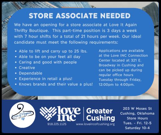 We have an opening for a store associate at Love It Again Thrifty Boutique.